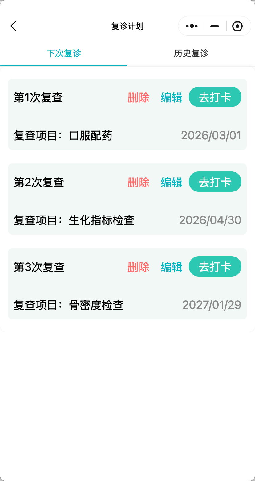 自动生成复诊计划和用药计划,到点提醒,帮助医生提升患者依从性